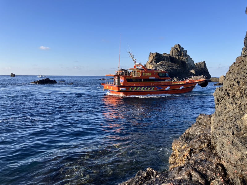 1日目は鵜来島本島の磯割、ホトバエ廻り。風の島と呼ばれる鵜来島でも強め目、15m程の北風が吹き荒れる状況。風裏になる港から出てすぐの安全な磯、『港の1番』で口太狙い。「明日が本番なので今日は程々に」との事。