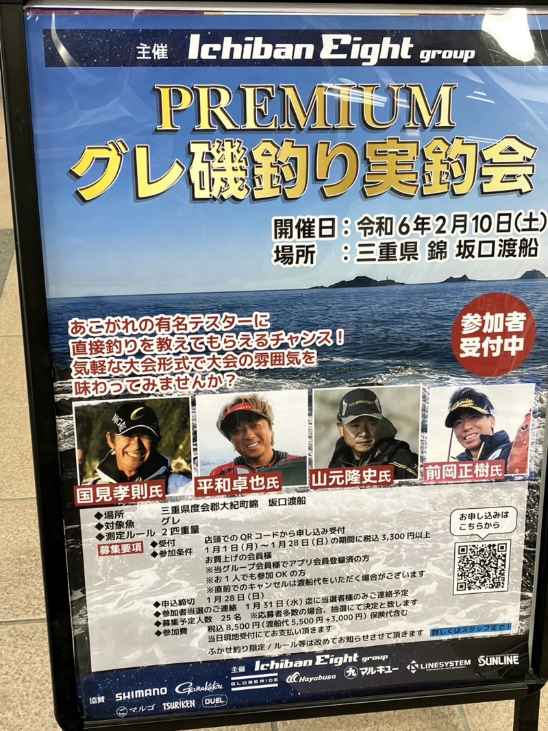 イチバンエイトグループでは2024年2月10日(土)、三重県錦で『PREMIUMグレ釣り実釣会』を開催。グレ釣りの有名テスター様が直接釣りのアドバイスをしてくれる貴重な機会。