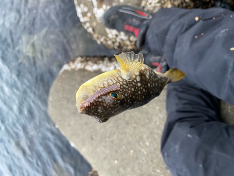 沈黙が続いてからやっとウキが少し沈む違和感を合わせると外道の定番、フグからスタート🐡