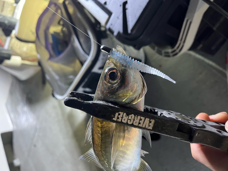 この日のアタリワームとカラーは、ジャッカルのペケリング2.5の「湾岸チャートグロークラッシュ」でした。