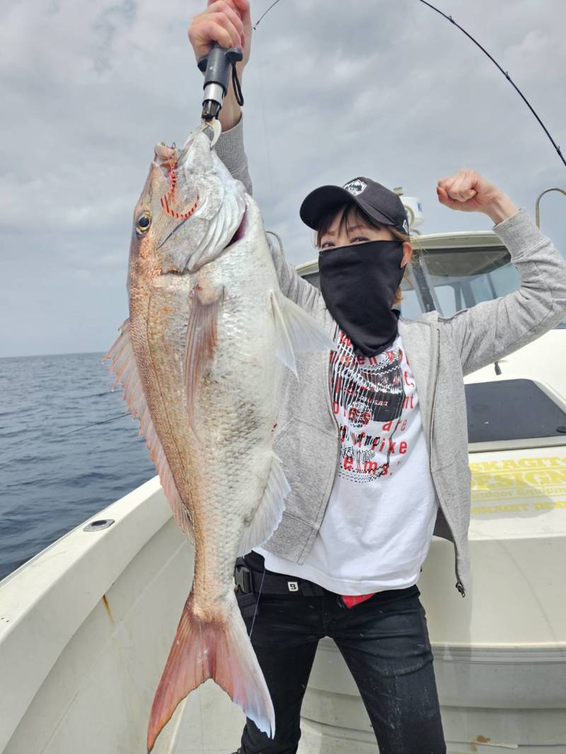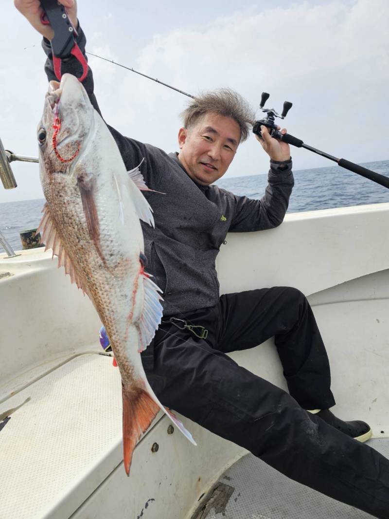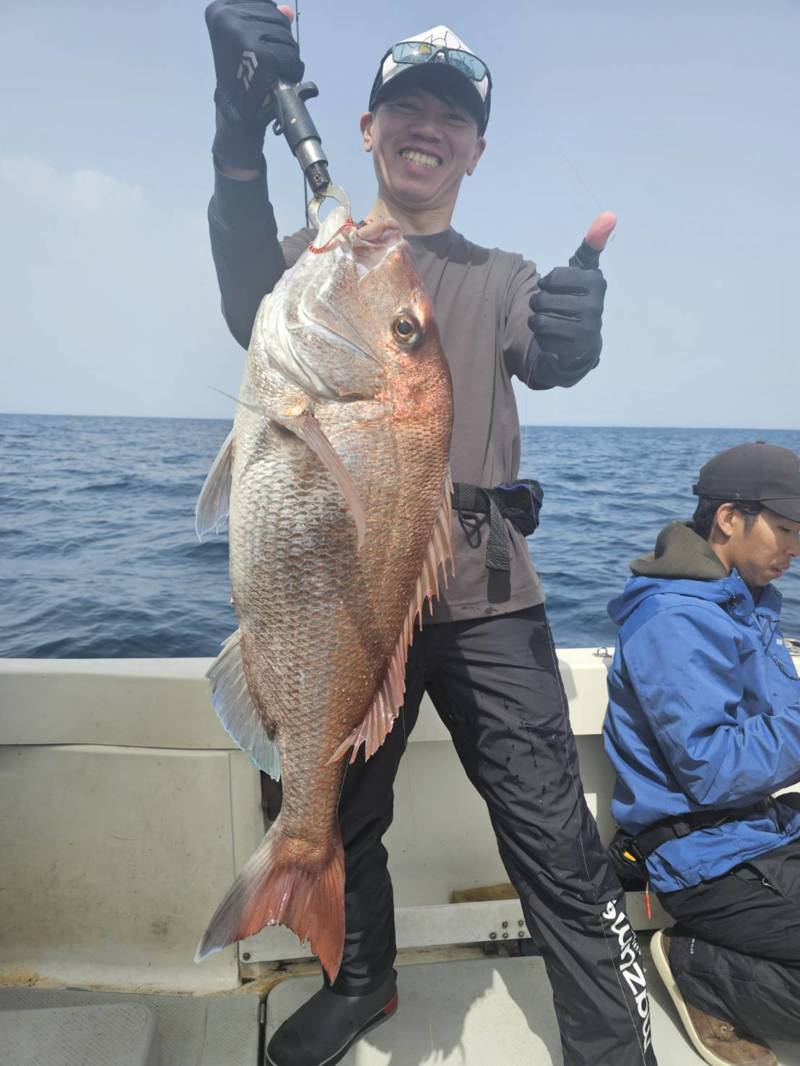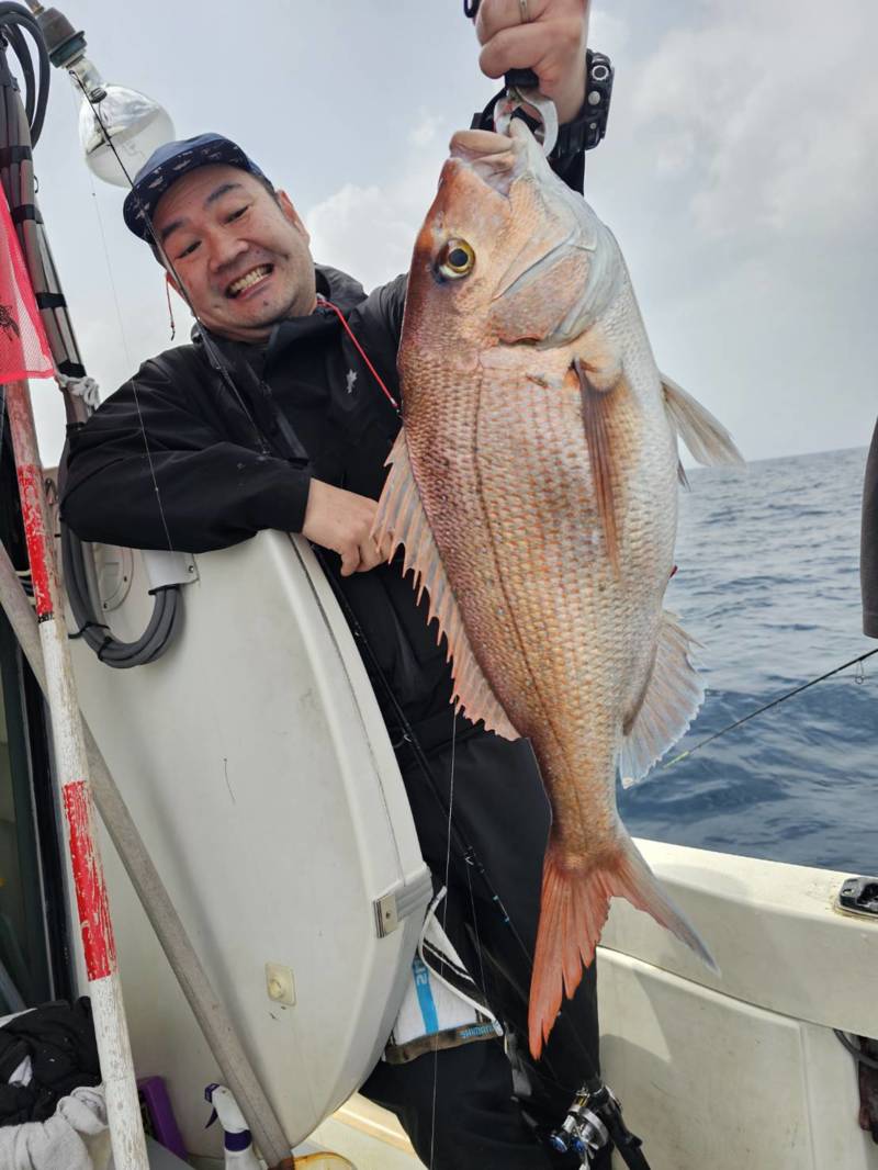 どう考えても普通の鯛の引きではない重量感とパワーで浮いてきたのは圧巻のナナマルオーバー!!