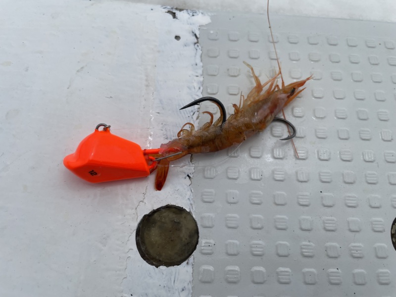 この釣りはテンヤにエビやホタルイカなどのエサを付けたシンプルな仕掛け🦐