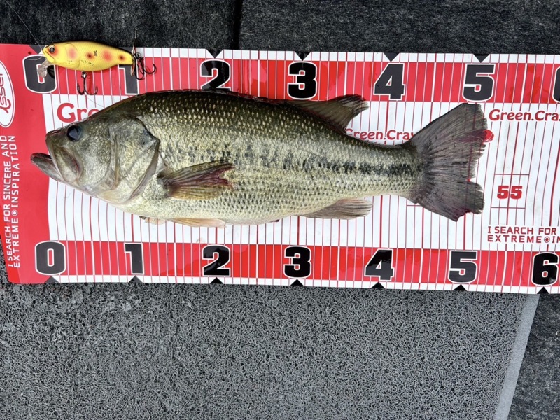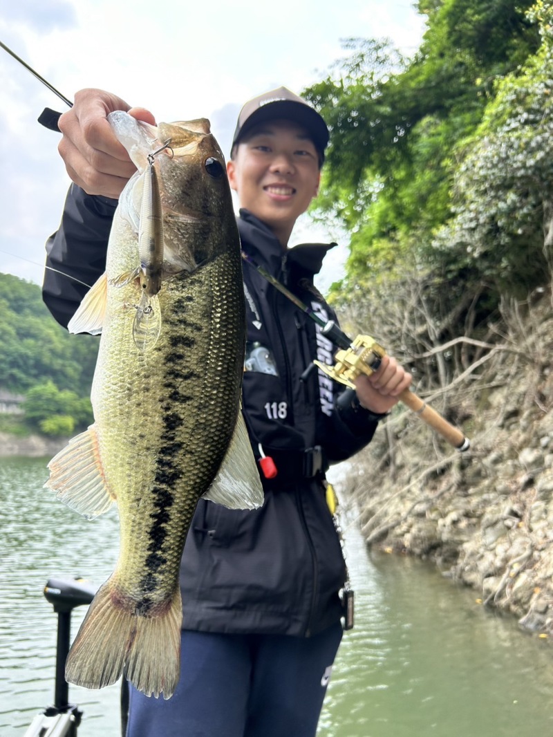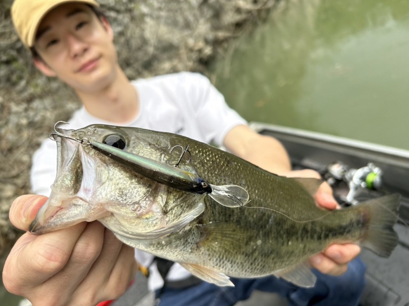 そこで、オイカワのようなベイトが浮いていたので、キッカーイーターでバンクを流していると良型のバスを釣ることができました!