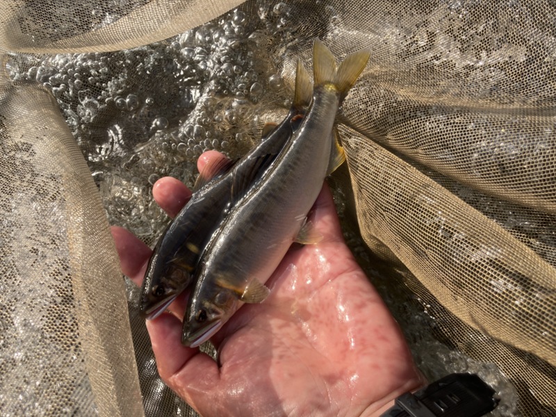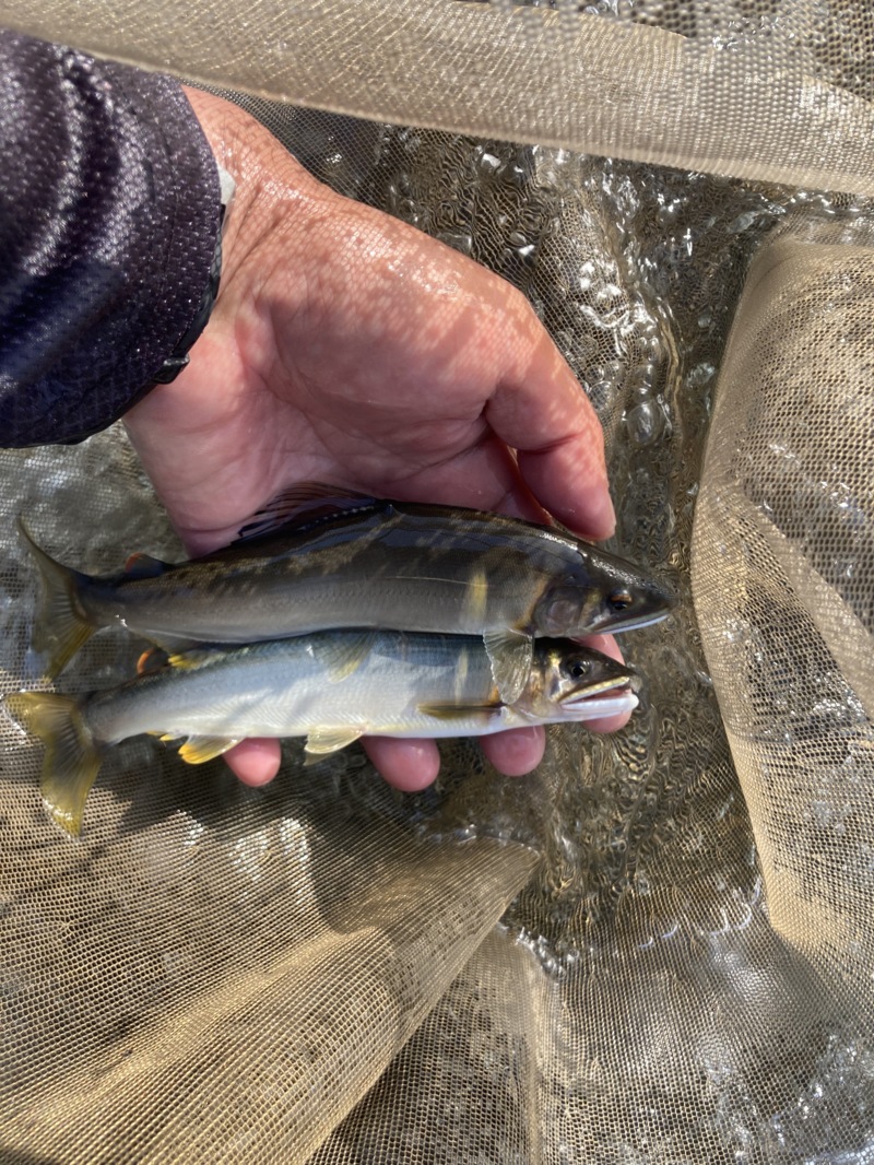 上流とは違って鮎の追いは◎ サイズはバラバラで20cm近い良型から超小鮎まで。オトリにならないのはリリースしていきキープサイズは最終二人で60匹ほどでした。