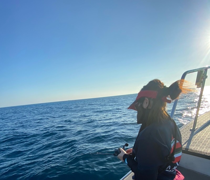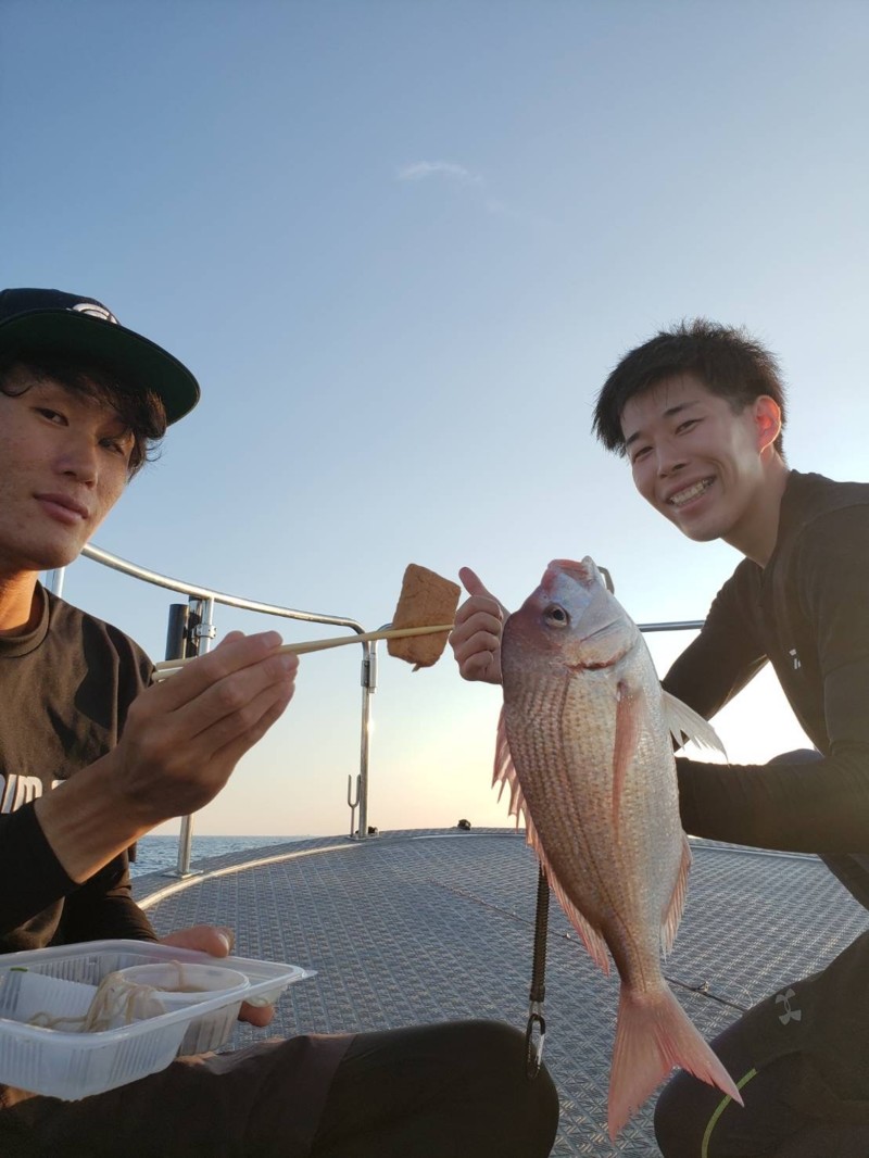 スタッフ日浅は明るい間はタイラバをセットし巻き巻きしていると、食べごろの真鯛が釣れご満悦笑
