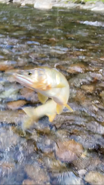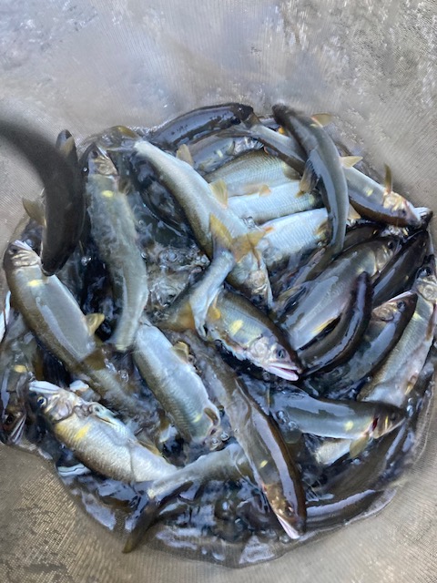 場所移動も大変なのでウロウロと釣り下がっていきますがたまに釣れる程度。下流の本命ポイントに近づくと他の釣り人の姿が見えたので元の場所に戻っていき普段はあまりやらない超浅瀬で泳がせると良型が多数反応! 誰もやらなさそうな所を釣っていき13時までになんとか20匹確保。