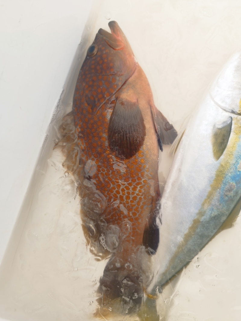 イワシが掛かり、底から少し切って置いておくのがオススメで、底ベッタリだとガシラが多く、少し底から上げるとヒラメやアコウが狙えます。
