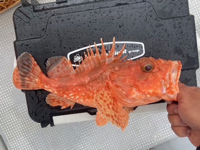 上潮が少し動く程度でアヤメカサゴなどのカラフルな外道がぼちぼちと釣れるだけでしたが、ウネリが少し落ちて雨も止んでからは底潮が少しは動き出したのか反応が少しずつ良くなり、ようやく鬼カサゴがヒット!