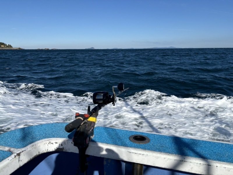 2時間程沖合で釣りをした後、カンパチ狙いで第二のポイントへ移動。30分ほど経ってから、鯛の引きとは異なる竿を海中に引きずり込む様な強い引き、3分程の魚と格闘を交えましたが、ドラグの緩め方が甘かった為、仕掛け丸ごと引きちぎられ惨敗。船長や常連の方々曰く、シマアジとの事。