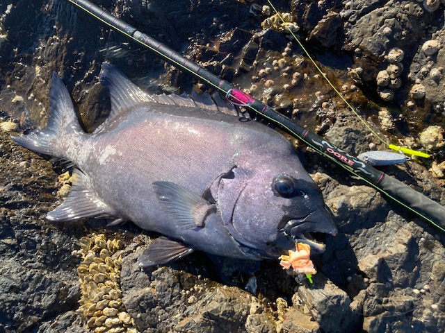 『やられた!』と思いましたがなんとかしようと立ち位置を変え糸を緩めて時間を少し置いて待つと運よく動き出し根から出すことに成功!もう入られまいと強引にやりとりをしてやっと浮いてきたのは本命石鯛の銀ワサ!瀬ズレを入れてないので打ち寄せる波を利用して取り込み釣り上げることが出来ました。