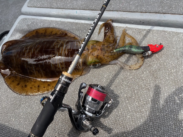 水深は20m〜40mライン、エギは3.5号30gに潮の加減を見ながら20〜40gの仮面シンカーを付けて使用しました❗️