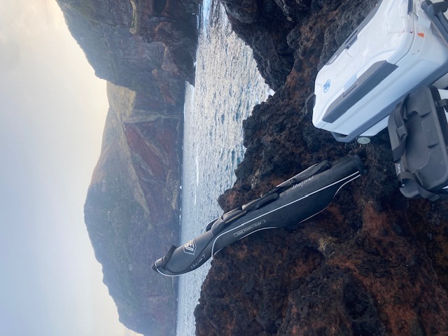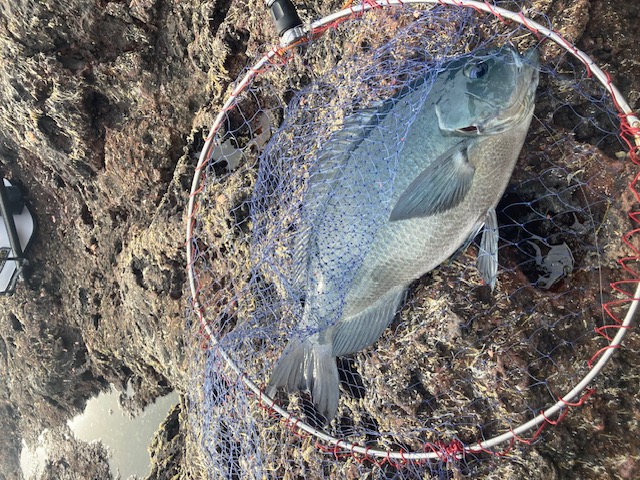 出船前にドッキー船長に挨拶をしていざ出船! 1時間半ほどしてポイントに到着し2名ずつ分かれて渡礁しましたが前日の大きなウネリが残っていて釣り開始までアタフタしましたがなんとか釣り開始しますが横からの強風とかなり速い潮とウネリに苦戦しましたがウネリが落ち始めると良型のグレが釣れだし一安心。