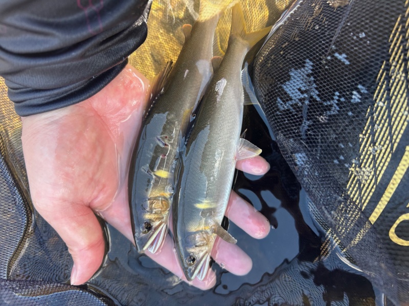 平均サイスは18cm程度で大鮎サイズの時期に物足りないかもしれませんが、ピチピチ真っ黄色の海産鮎が目印を飛ばしてくれる感覚は最高ですね!