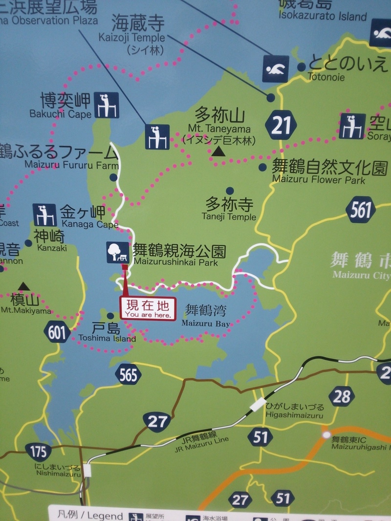 - 大阪からだと、大山崎ICから京都縦貫道で綾部を経由舞鶴若狭道へ。舞鶴東ICで降りて県道28⇒国道27⇒県道21へ入り舞鶴親海公園へ。舞鶴東ICから約30分で着きます。大阪市内からでも2時間以内で行けとても便利になりました