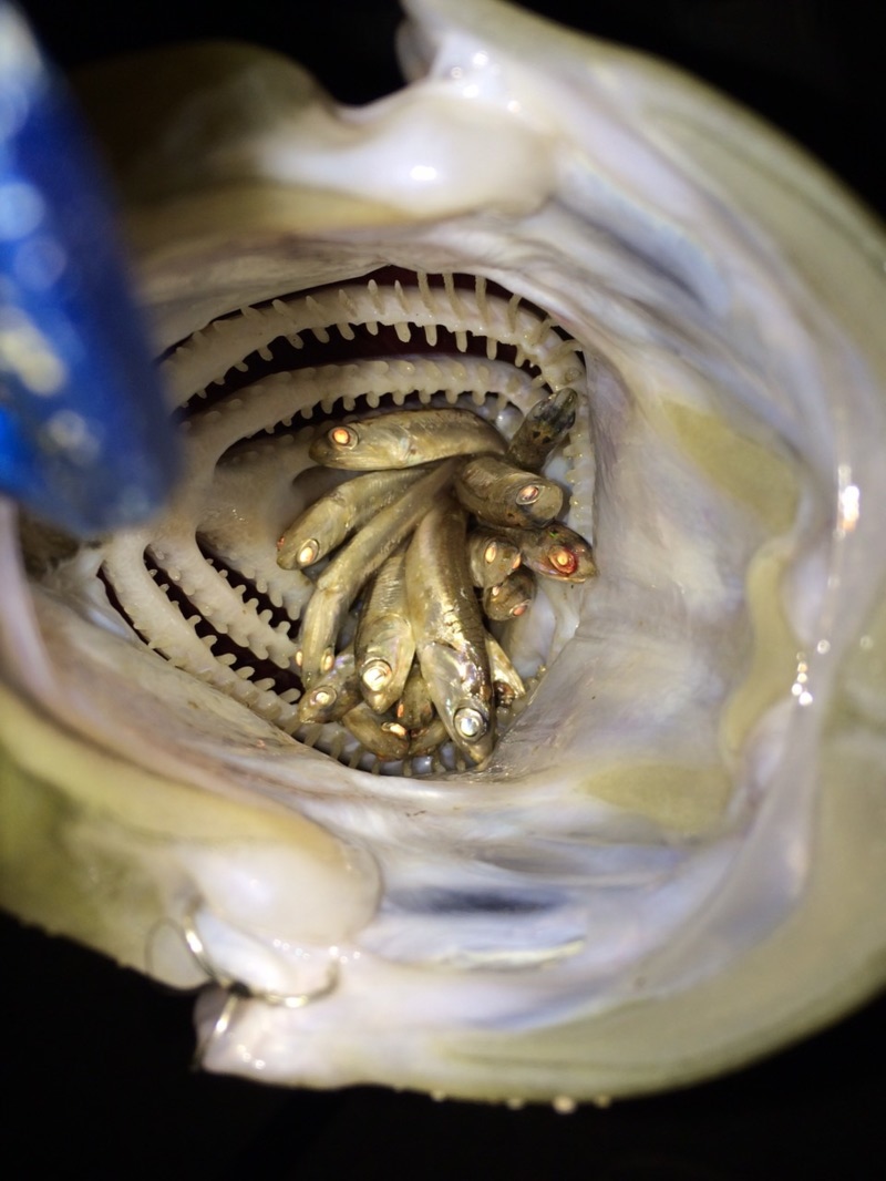 5㎝~7cm位のカタクチイワシにシーバスが付いていますので、小型のシンペン、バイブ等が良くアタリます!