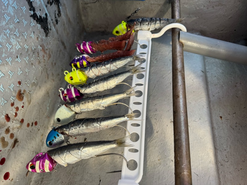 エサは4種類(①生イワシ②マルキュー軽締めアミノリキッド漬けのイワシ③塩で水分を抜いたイワシ④マルキュー塩エビ粉で締めたサンマ)持って行きましたが、反応が薄い時間は軽締めイワシが反応が濃い時は締めたサンマが良かったです