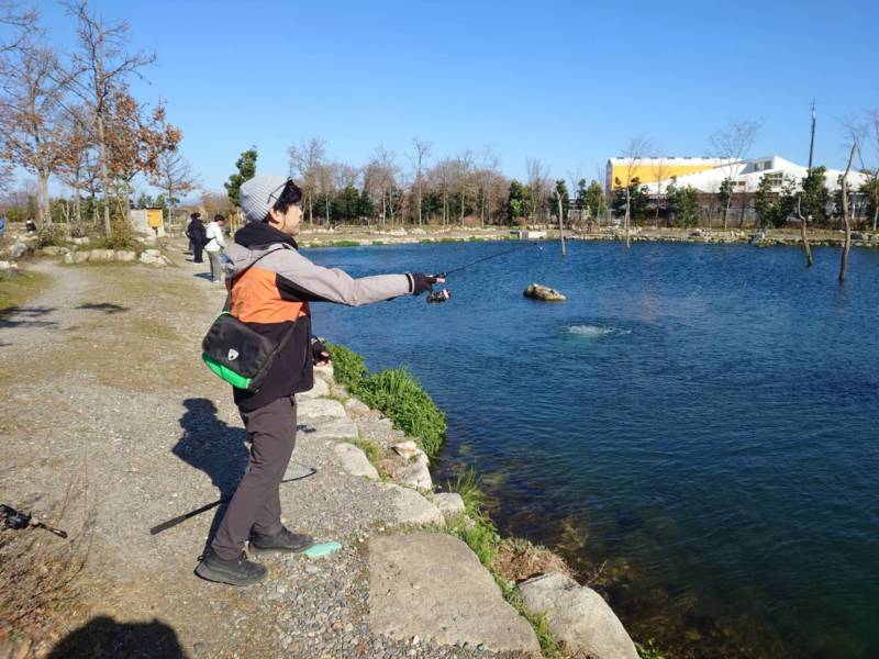 まずは水質がクリアで魚の数も多い第一ポンドで数種類のプラグを使い、目視で魚の反応を見ました。反応が良いプラグを確認して第二、第三ポンドで実(戦い)