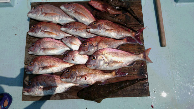 その後も潮止まりまでコンスタントに釣れ続け、初挑戦のスタッフはマダイ6枚!