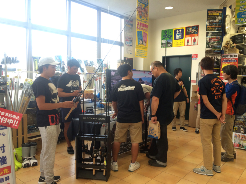 皆様、琵琶湖専用設計のバスロッドを熱心に手にとって体感していただいております!