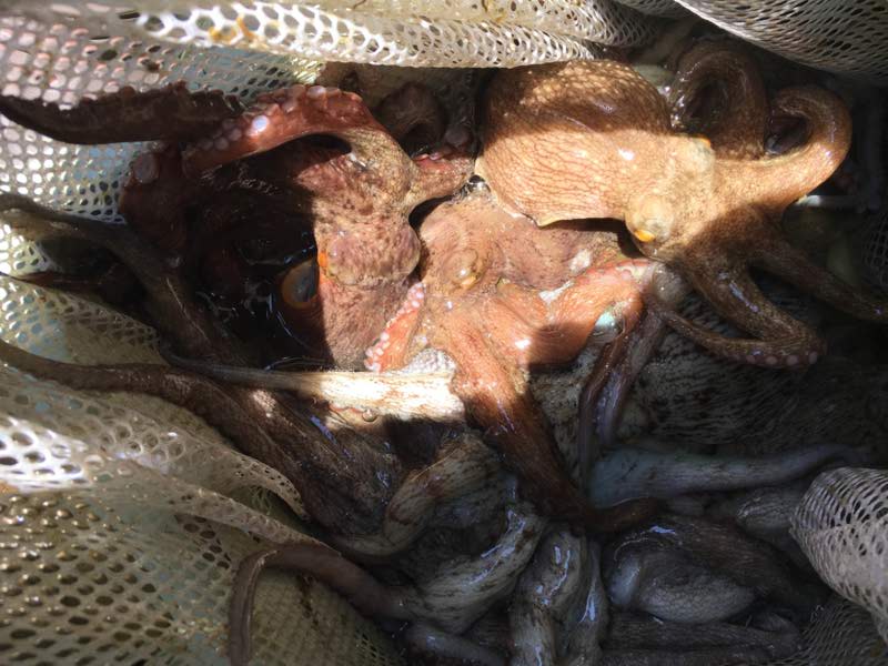 「重いんですけど~」と言ったら、「引っかかってるんかな?上まで上げよっか。」と言われ、上まで上げたらなんと、タコがついてましたー!!