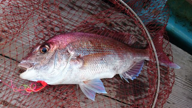 朝のうちに地合で、イワシにはまだ反応が薄いとのことでタイラバからスタート!瀬戸内側の比較的水深の浅いエリアで数流しで40センチオーバーの刺身サイズをゲット!幸先は良かったものの、船中1,2枚上げたところでモーニングバイト終了・・