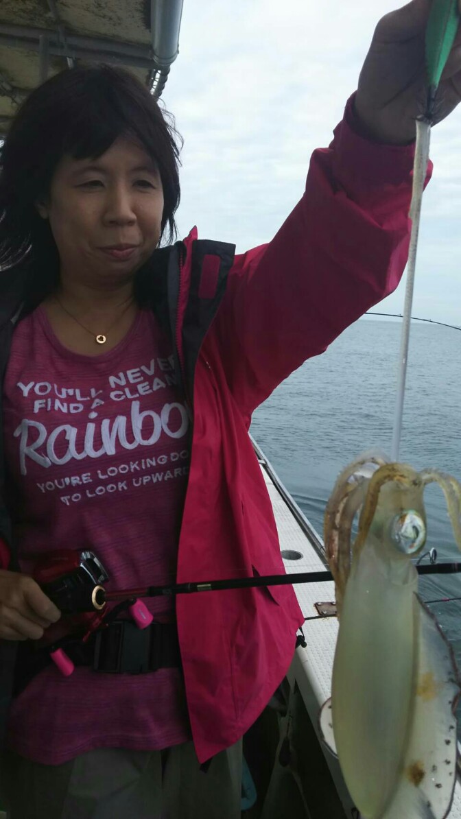 最近は天気が ずーーーっと悪く雨の中での釣りを覚悟していたのですが、普段の行いが良かったのか?? この日は曇りで快適でした。 今が旬、しかも人気の釣りなので平日にもかかわらず船は満席!! 30号のオモリの胴突き仕掛で1ヒロのエダスにエギを付けて釣るのですが、ポイントによっては潮の流れが速くオマツリする事も何度かありました。それでも店長に世話してもらってくじける事なく釣りを続けました、店長ありがとう。( 感謝 )
