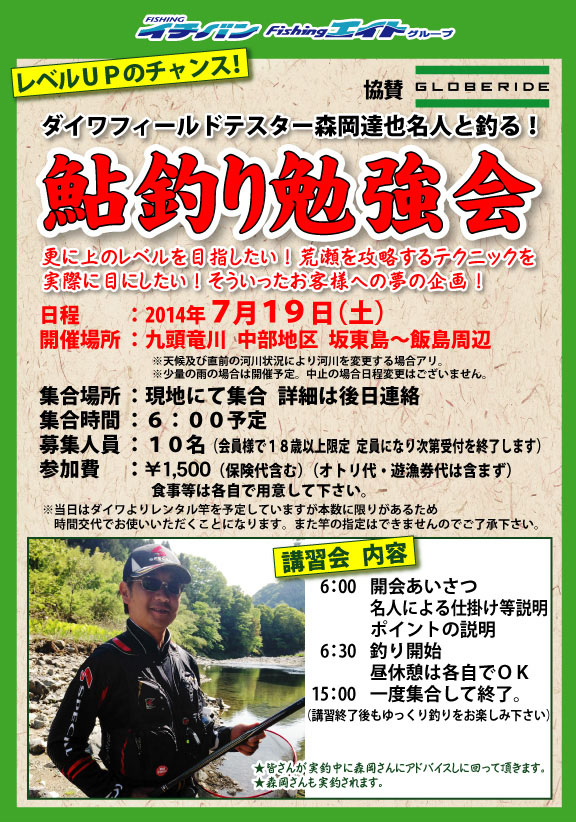 7月19日(土)九頭竜川 中部地区 坂東島~飯島周辺にて、ダイワフィールドテスター森岡達也名人と釣る「鮎釣り勉強会」が開催されます。更に上のレベルを目指したい!荒瀬を攻略するテクニックを実際に目にしたい!そういったお客様への夢の企画です!講習では、皆様が実釣中に森岡名人がアドバイスをくださいます。ご応募お待ちしております。(7/19(土)開催のこの勉強会は7/4(金)応募締切りです)