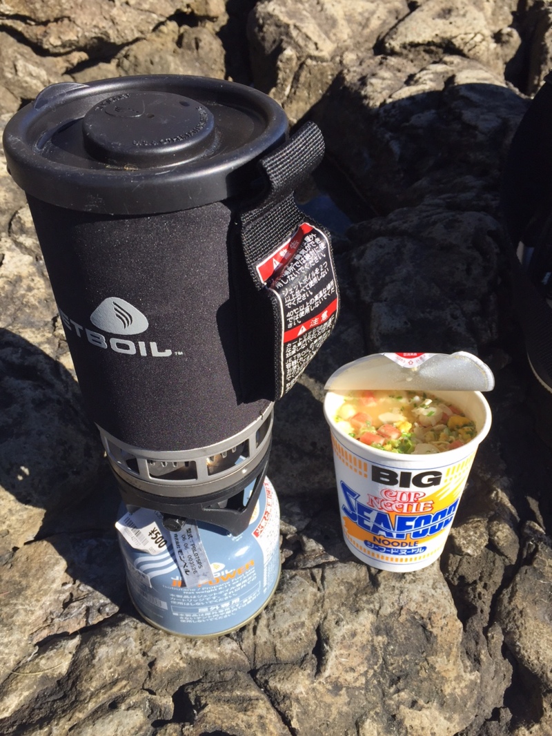 お昼ご飯はカップヌードル!ジェットボイルは沸くのが早く、コンパクトで重宝します!