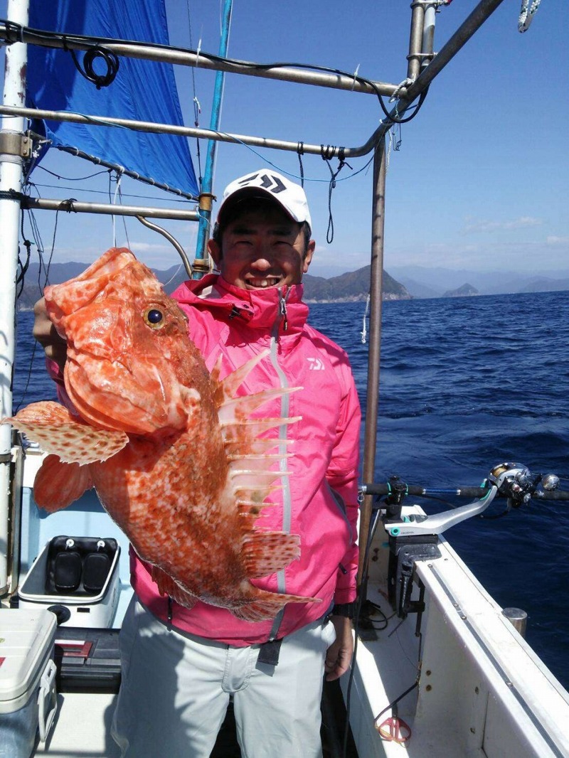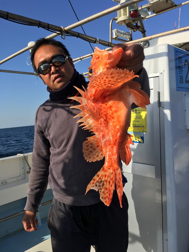 感心していると今度は同行者の床並もヒットし、はやくも良型確保!こちらとしてはあせりますが、船長のアドバイスどおり底取りを何度も繰り返していくと根掛かりしたかのような重みが!聞き合わせからしっかりと合わせを入れ直すと会心の重量感と手ごたえ!一気に巻きあげますがオニカサゴは水圧の変化に強いため暴れながらしかも大口を開けたまま水面までくるので何とも言えません!