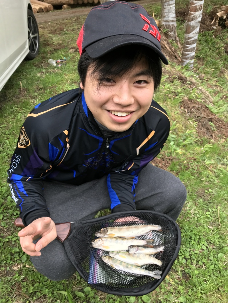 ここしかないっ!そうっと体をかがめ、エサを投入すると目印が動き、小ぶりですが綺麗な色をしたお目当てのアマゴをゲット!