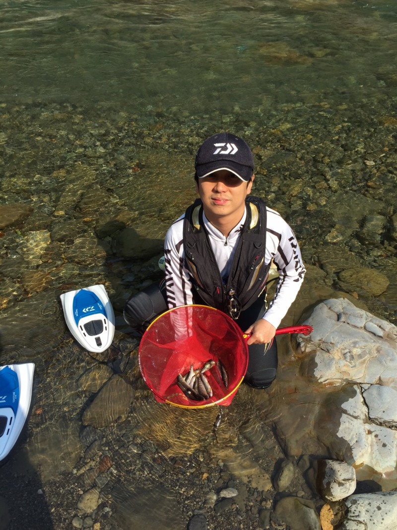 まだまだ冷たい川に震えながらオトリを泳がすと開始15分ほどで10cmほどですが、海産の鮎をゲット。鮎の存在を確認できたので一安心。