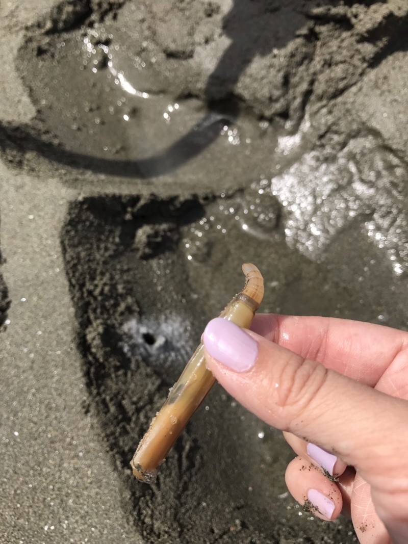 マテ貝は初めてで動画とかしか見た事が無く、とりあえず掘っている人の近くに行き掘るとひし形の穴を発見!
