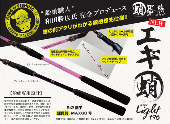 また、新製品の船タコ専用ロッド・エギ蛸ライト190をイベント中にご成約頂きますと、特性トートバックかタックルBOXをプレゼント!