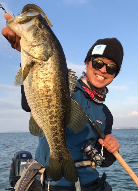 お昼休憩を終え湖を見ると、南西風爆風となり、午前とは別の湖となっていました。移動を繰り返し、何度かアタリがあるもののフックアップせず。夕方、ラスト30分前にジグヘッドで諸富さんが40UPを釣り終了しました。