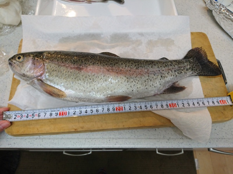 受付を済ませると管理人さんが天秤を担いで、目の前でマスを放流してくれました。