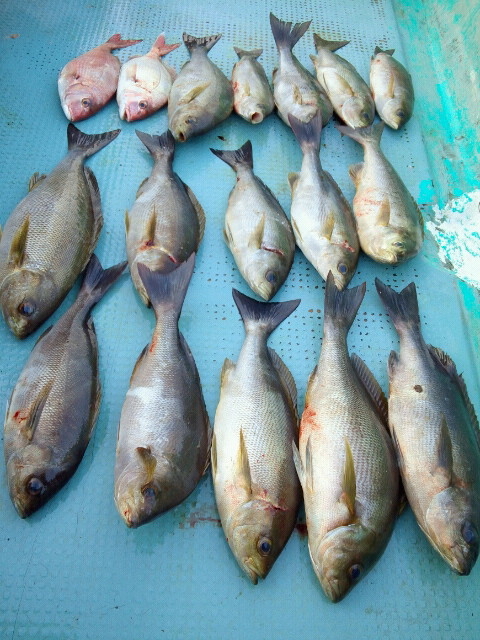 結果はイサキが40センチを筆頭に、小型のウリ坊サイズは全てリリースしても、真鯛やサンバソウも混じって18匹プラスアジフライ多数笑と言う好釣果となりました。