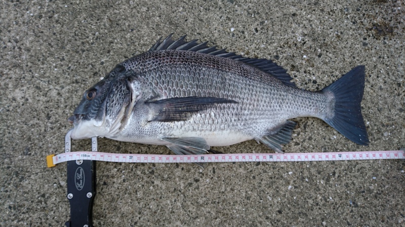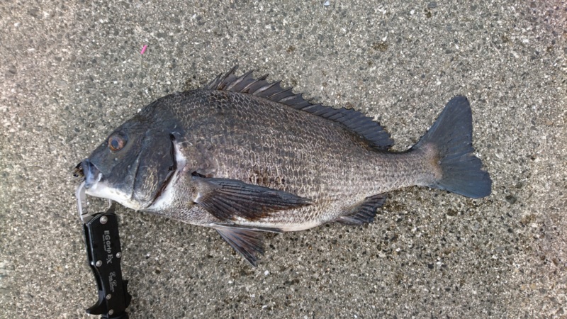 1投目は、不発。2投目に目印一杯で当たりがでて、元気いっぱいに引いた魚は37cm程の本命チヌ。