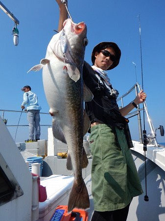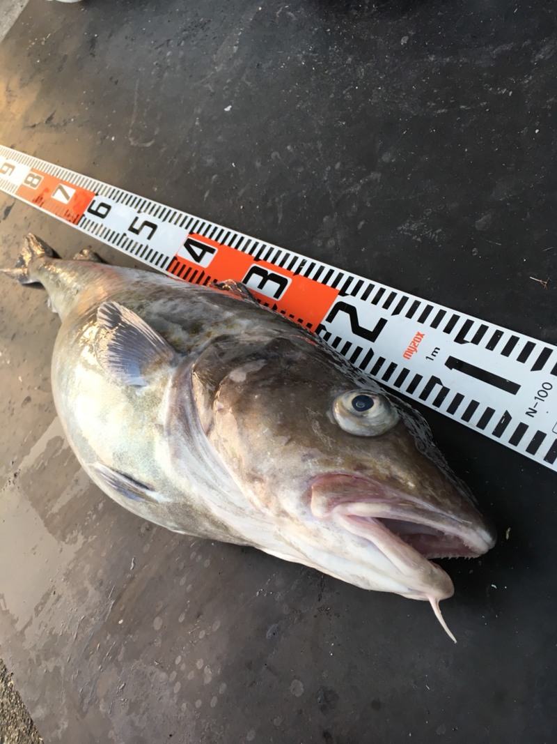 出船から1時間30分程走り、浦島方面から釣りをスタートしました。水深は160M~230Mでジグはスピンドルの350gから落とし始め、2流し目程した時、底から1Mをフリーフォールをさせているとアタリがあり、この日最大となる70cmのタラがヒットしました。