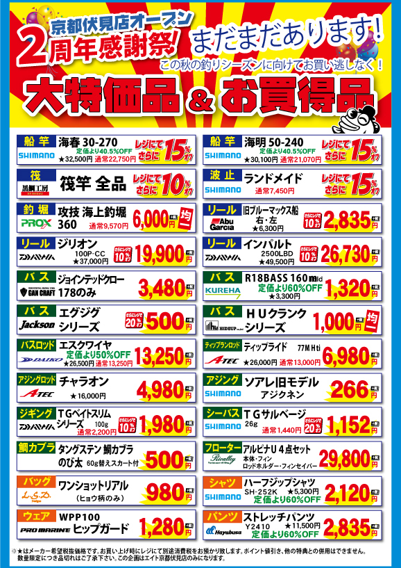 京都伏見店は2周年を迎え、第一弾、第二弾とイベントを開催し、11/1~9のの期間、日頃のご愛顧を感謝を込めまして、第三弾企画 大特価アイテム大放出致します。