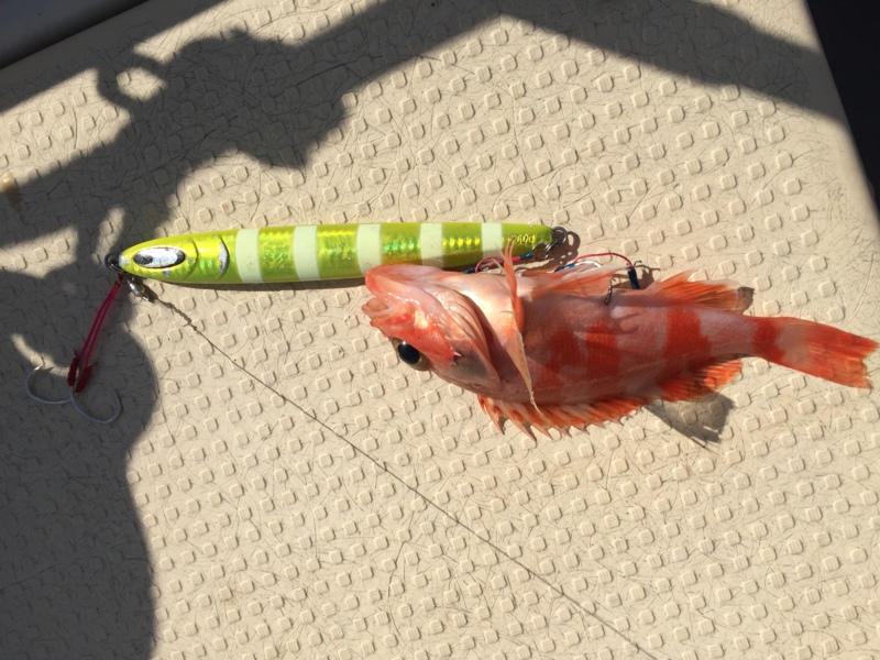 午後は風が止んだタイミングで200メートルの中深海にも探りにいき、35センチ程度のアラ2匹、ユメカサゴ1匹を追加し、納竿となりました。