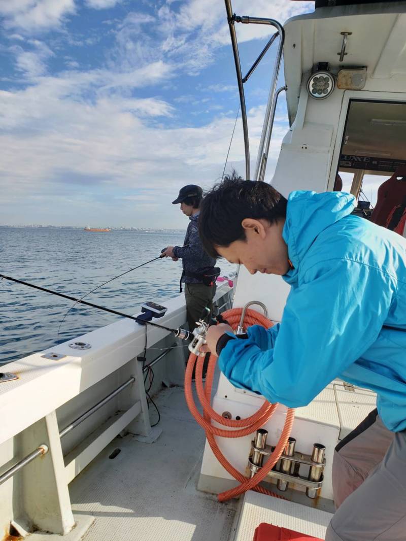 活性が高くなりそこからは昼過ぎまで反応がまんべんなく出て、結果スタッフ2人と同行者の3人で鯛9枚、ハマチ2本、アコウ1本とバラシ等もありましたが、