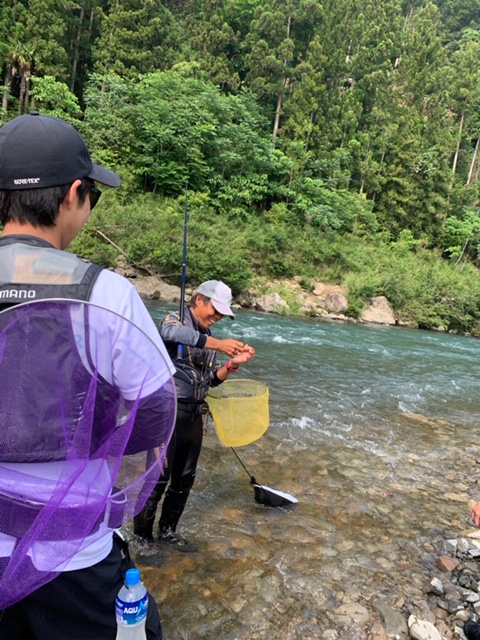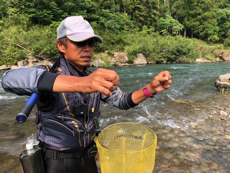 やや増水気味でササ濁りの中ですが名人の講習スタート。