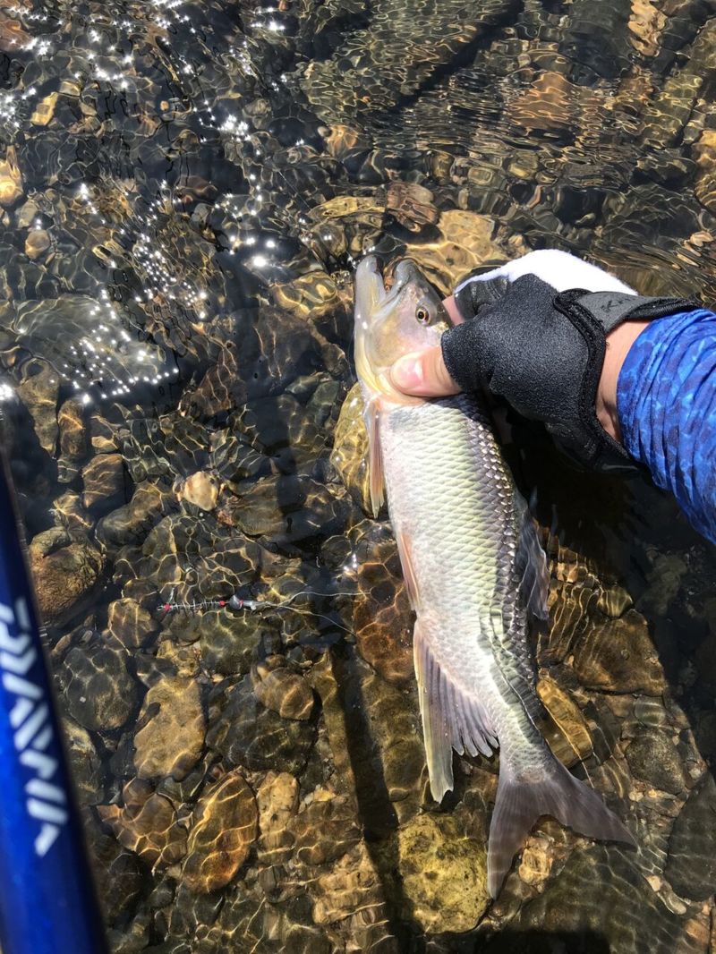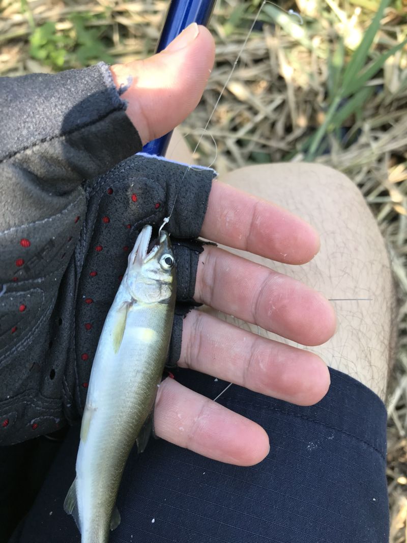 少し流れ込みの場所に竿を振ると、やっと本日初の小鮎が!!サイズは9cmと小さいですが、ヤル気がでてきました!!