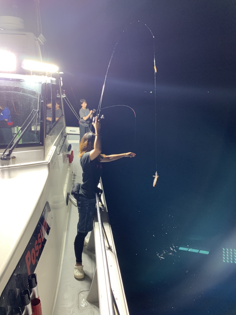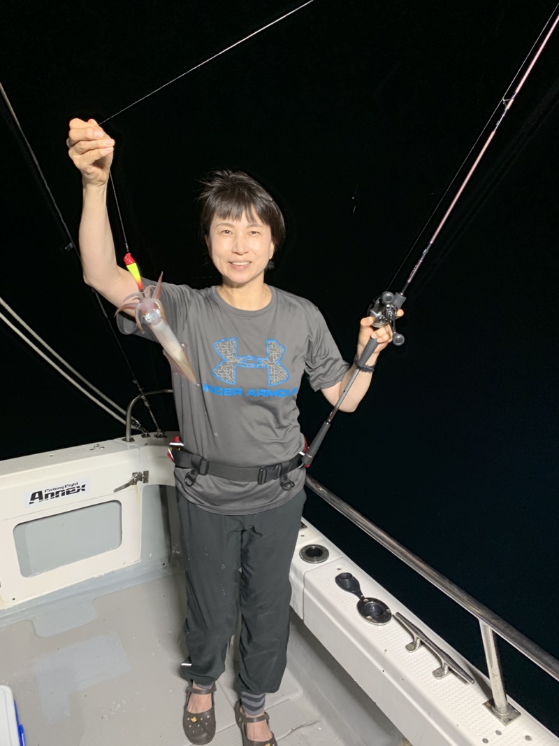 しばらくして船長が棚が少し浅くなったから、もう少し深い所を攻めても良いかもとの事なので、思い切って80mまで落としてみました。すると今までで1番大きなあたりが来ました!かなり引きが強いので期待を膨らませてあがってきたのは30cm程のスルメイカでした。まだサイズは良い方なのでお土産に持って帰ることに決めました。それから同じタナを探ってもたまにあたりがあるだけで、イカがいるタナがぼやけてしまいました。さらに終盤になると潮も止まってしまい、完全にあたりは無くなってしまいました。どこかいないかとタナをこまめに変えましたが、終了の時間が来てしまいました…。