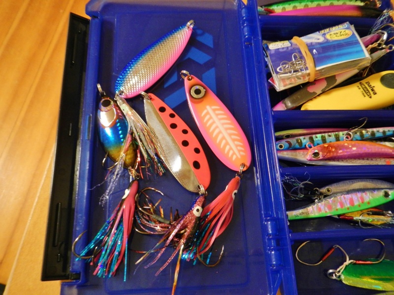 今回は「ウキルアー釣り」と言う蛍光フロートに1m位リーダーを取り45g位のスプーンにタコベイトを付け、フックには、カツオを小さくカットした切り身を付けるハイブリッド的な仕掛けで10~13フィートのショアキャスティングロッドに4000番クラスのリールを付けてビュンビュン沖に投げて狙う。