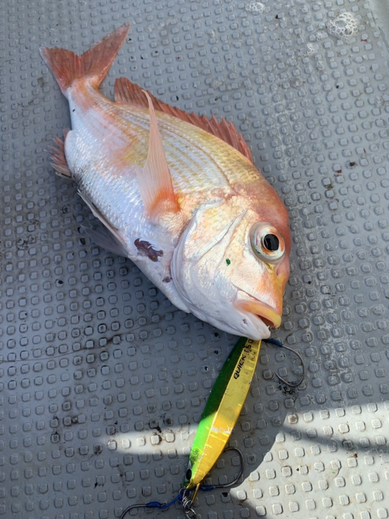 出船後、濁りのないかなり沖のポイントまで船を走らせポイントを探し始め、期待した時間帯はなにも釣れず、あちこちにポイント探しの放浪の旅へ…