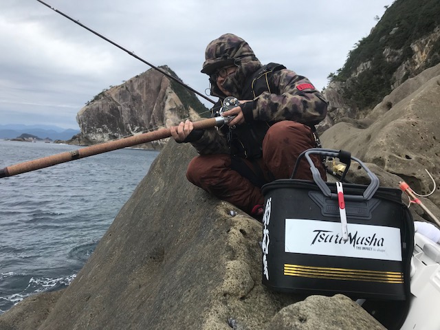 新鮮なウニを餌に、背後の絶壁に気をつけながら竿を振ります。