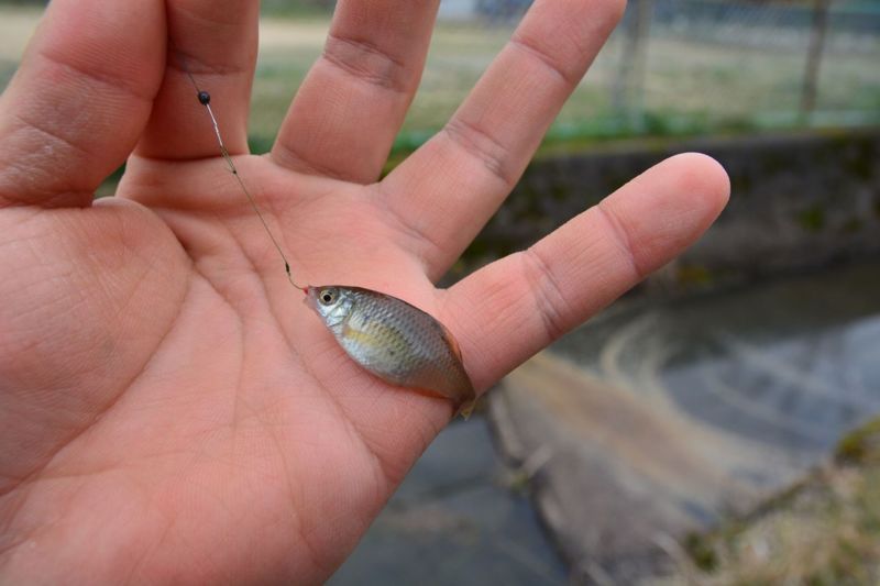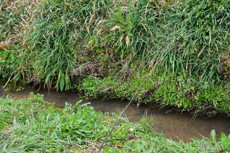 次に少し流れのある用水路へ。淀んでいる場所を見つけたので、竿をふります。