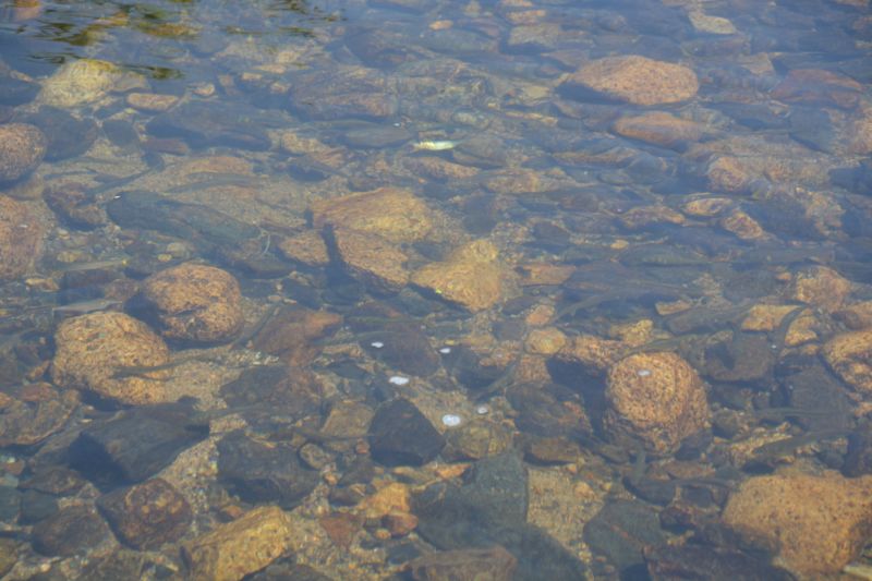水中には群れをなした小鮎とハスの姿が見えます。