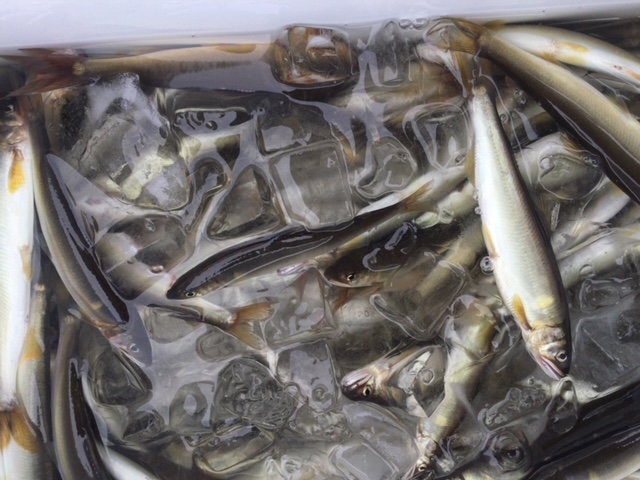 前日の雨でヤナが開いていたのか一投目から10センチのちび小鮎。